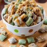 Caramel Apple Puppy Chow is a fun and colorful snack mix featuring Apple Cinnamon Chex cereal coated in vibrant green candy melts and a cinnamon-vanilla cake mix blend, combined with granola for extra crunch and finished with a drizzle of caramel topping. This festive treat offers a delightful balance of sweetness and spice, perfect for parties or anytime snacking.