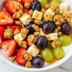 - Assemble the Fruit Salad: Once the cheesecake bites are chilled, take a serving dish and layer the halved strawberries, green grapes, red grapes, and the cheesecake bites evenly to create a colorful mix.