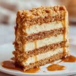 - Assemble the Cake: Place one cake layer on a serving plate. Spread a generous layer of cream cheese filling, sprinkle with some streusel, and drizzle caramel sauce over it. Repeat with remaining layers. Finish by topping the cake with the remaining streusel and a drizzle of caramel sauce.