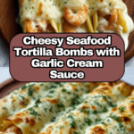 Keywords: cheesy seafood tortilla bombs, shrimp crab appetizer, baked seafood tortillas, garlic cream sauce, cheesy seafood rolls