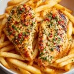 This Chicken Fillet in Spicy Creamy Garlic-Parmesan Sauce is a deliciously rich and flavorful dish featuring tender chicken fillets cooked to perfection in a creamy garlic and Parmesan sauce with a hint of spice from red pepper flakes. Served alongside crispy fries and garnished with fresh parsley, this meal is perfect for a comforting dinner that’s both easy to prepare and impressively tasty.