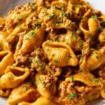 Keywords: Beef and Shells, comfort food, creamy beef pasta, creamy tomato sauce, easy dinner recipe