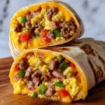 A hearty and flavorful Cowboy Breakfast Burrito packed with savory ground pork sausage, kielbasa, crispy hash browns, sautéed peppers and onions, creamy scrambled eggs, and a blend of sharp cheddar and Monterey Jack cheese wrapped in a warm flour tortilla, then lightly pan-fried to golden perfection. Perfect for a satisfying breakfast or brunch.