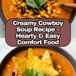 This Creamy Cowboy Soup is a hearty and comforting dish packed with ground beef, beans, potatoes, corn, and a blend of smoky spices. Finished with creamy cheese and garnished with fresh green onions and crunchy tortilla chips, it’s a perfect one-pot meal to warm you up on any day. The recipe is versatile, allowing substitutions like ground turkey or vegetable broth for dietary preferences, making it both flavorful and adaptable.