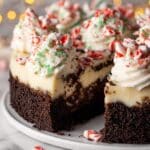 - Frost the cheesecake: Spread the whipped cream evenly over the chilled cheesecake. Sprinkle generously with peppermint chips or crushed candy canes for a festive touch.