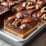 - Chill and Serve: Allow the bars to cool completely at room temperature for at least 1 hour to help the layers set. For cleaner, easier slicing, refrigerate the bars for an additional 30 minutes. Before serving, sprinkle the extra pecans on top as decoration and for extra crunch. Slice into bars and enjoy!
