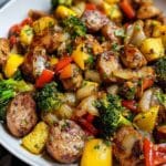 This Easy Blackstone Cowboy Stir Fry Dinner is a quick and flavorful one-pan meal that combines smoky sausage, tender Yukon gold potatoes, and fresh vegetables cooked to perfection on a griddle or skillet. Ready in just 30 minutes, it’s perfect for busy weeknights or casual family dinners. The dish offers a delightful mix of crispy potatoes, browned sausage, and vibrant vegetables seasoned with garlic, onion, and smoked paprika for a hearty and satisfying meal.