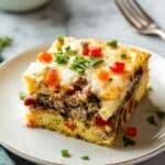 This Easy Egg Bake Casserole is a savory, protein-packed breakfast dish featuring a flavorful mix of crispy bacon, sautéed onions, garlic, red and green bell peppers, and cheddar cheese baked to perfection. Ideal for a wholesome morning meal or brunch, it combines simple ingredients into a hearty casserole that’s both satisfying and easy to prepare.