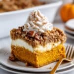 Store leftover pumpkin dump cake in an airtight container in the refrigerator for up to 4 days. Reheat individual portions in the microwave for 20-30 seconds or until warm. The cake also freezes well—wrap tightly and freeze for up to 2 months; thaw overnight in the fridge before reheating.