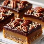 These Easy Turtle Bars feature a buttery shortbread crust topped with crunchy pecans, a rich homemade caramel layer, and a smooth melted chocolate topping. Finished with extra pecans, sea salt flakes, and drizzled caramel sauce, these bars combine sweet, salty, and nutty flavors perfectly for a decadent dessert.