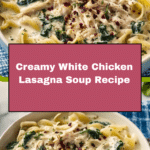 This Easy White Chicken Lasagna Soup is a comforting and flavorful twist on traditional lasagna. Combining tender shredded chicken, sun-dried tomatoes, Italian seasoning, and creamy half-and-half, it simmers into a hearty soup with campanelle pasta and fresh spinach. Topped with ricotta, Parmesan, and mozzarella cheeses, this dish delivers all the cozy, cheesy goodness of lasagna in a warm, spoonable form perfect for any occasion.