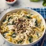 - Combine All Components and Finish: Return shredded chicken to the pot, then add cooked pasta and fresh spinach. Stir gently and heat through for 1-2 minutes until spinach wilts. Taste and adjust seasoning if necessary.
