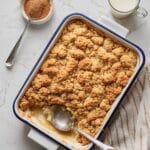 Store any leftover cake in an airtight container in the refrigerator for up to 4 days. Reheat gently in the microwave or oven until warmed through before serving. The cake can also be assembled the night before; simply cover and refrigerate for up to 24 hours before baking.