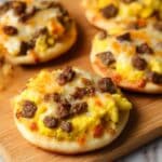A hearty and comforting English Muffin Breakfast Pizza featuring toasted English muffins topped with creamy sausage gravy, fluffy scrambled eggs, savory breakfast sausage, and melted mild cheddar cheese, finished under the broiler for a bubbly cheese topping.