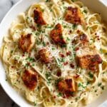 - Assemble & Serve: Plate the creamy parmesan pasta and top it with the garlic butter chicken bites. Garnish with extra parmesan cheese and fresh parsley if desired. Serve immediately and enjoy!