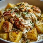 This Garlic Parmesan Crockpot Chicken and Potatoes recipe offers a flavorful and effortless one-pot meal. Tender chicken breasts and halved baby potatoes are slow-cooked with a savory blend of garlic, Parmesan cheese, and Italian herbs, resulting in a deliciously aromatic and comforting dish perfect for busy weeknights.