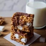 Golden Grahams S’mores Bars combine crunchy cereal, gooey marshmallows, and rich milk chocolate chips to create a deliciously sticky and sweet treat. These no-bake bars are perfect for satisfying your s’mores cravings anytime, easily prepared by melting marshmallows, chocolate, butter, and corn syrup, then mixing them with cereal and extra marshmallows before setting to harden.