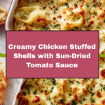 Keywords: stuffed shells, chicken stuffed shells, baked pasta shells, Italian chicken pasta, sun-dried tomato sauce, creamy pasta bake