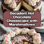 Indulge in the rich and creamy Hot Chocolate Cheesecake, featuring a chocolate graham cracker crust and a luscious cocoa-infused cream cheese filling with mini marshmallows and chocolate chips. Topped with whipped cream, chocolate shavings, and extra marshmallows, this decadent dessert perfectly captures the cozy flavors of hot chocolate in a sophisticated cheesecake form.