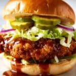 A delicious Hot Honey Chicken Sandwich featuring crispy fried chicken breasts tossed in a sweet and spicy honey hot sauce, served on toasted brioche or potato buns with fresh lettuce and pickles for a perfect balance of flavors and textures.
