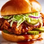 This Hot Honey Chicken Sandwich features crispy fried chicken breasts coated in crunchy panko breadcrumbs, drizzled with a sweet and spicy hot honey sauce, and layered with fresh lettuce and pickles on a toasted brioche or potato bun. A perfect balance of heat and sweetness, this sandwich delivers bold flavors and satisfying textures for a delicious lunch or dinner option.