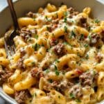 Keywords: cheeseburger pasta, alfredo pasta, ground beef pasta, loaded pasta, comfort food, creamy pasta, bacon pasta, quick dinner