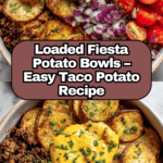 Loaded Fiesta Potato Bowls are a delicious and colorful meal combining crispy roasted russet potatoes seasoned with chili powder and smoked paprika, topped with savory taco-seasoned ground beef or black beans, melted cheese, fresh salsa, sour cream or Greek yogurt, and a variety of vibrant toppings like green onions, cilantro, and jalapeños. This easy-to-make dish packs all the flavors of a fiesta into one bowl, perfect for a satisfying lunch or dinner.