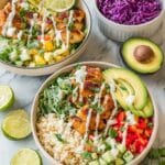 - Assembling the Bowls: Divide chopped romaine or mixed greens among 4 bowls as the base. Top each bowl with cabbage slaw. Add flaked fish on top, then arrange chosen toppings like tomatoes, bell peppers, red onion, jalapeño, pickled red onions, and cilantro around the fish. Dollop or drizzle avocado cream over each bowl. Sprinkle with cotija cheese if using and serve with lime wedges on the side.