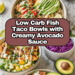 Keywords: Low Carb Fish Tacos, Fish Taco Bowls, Healthy Fish Recipe, Low Carb Dinner, Mexican Inspired Bowls, Avocado Cream Sauce