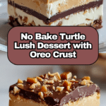 No Bake Turtle Lush is a decadent, layered dessert featuring a crunchy Oreo cookie crust, creamy sweetened cream cheese layer, rich chocolate pudding, luscious caramel sauce, and crunchy pecans. This no-bake dessert is easy to assemble, making it perfect for any occasion where you want to impress without turning on the oven. The combination of flavors and textures mimics the classic turtle candy experience in a luscious, chilled bar form.