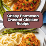 This Parmesan Crusted Chicken recipe features tender, juicy chicken breasts coated in a flavorful crust of Parmesan cheese, panko breadcrumbs, and aromatic herbs. The chicken is pan-fried to golden perfection, resulting in a crispy exterior and a succulent interior, perfect for a satisfying and easy weeknight meal.