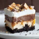 Peanut Butter Chocolate Lasagna is a decadent no-bake dessert featuring layers of Oreo cookie crust, creamy peanut butter and cream cheese filling, rich chocolate pudding, and a fluffy Cool Whip topping sprinkled with chopped Butterfinger candy bars. Perfectly chilled, this layered dessert combines classic flavors for a crowd-pleasing treat.