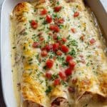 Queso chicken enchiladas are a creamy, cheesy Tex-Mex favorite that’s perfect for a quick weeknight dinner. Tender shredded chicken mixed with taco seasoning, sour cream, and cheddar cheese is rolled into soft flour tortillas, then smothered with a velvety queso blanco sauce with tomatoes and green chilies. Baked until bubbly and golden, this dish is comforting, flavorful, and sure to please the whole family.