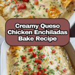 Queso Chicken Enchiladas Bake is a comforting Tex-Mex dish featuring tender shredded chicken mixed with taco seasoning, sour cream, cheddar cheese, and green chilies, all rolled into soft burrito-sized flour tortillas. These enchiladas are smothered in a creamy, velvety queso blanco Velveeta cheese sauce blended with diced tomatoes and green chilies, then baked until bubbly and golden. This easy-to-make casserole is perfect for busy weeknights, offering a rich, cheesy, and mildly spiced main course that the whole family will enjoy.