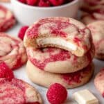 These Raspberry White Chocolate Cheesecake Cookies are a decadent treat featuring a creamy white chocolate cheesecake center surrounded by soft, fluffy cookies with pockets of homemade raspberry jam. The perfect balance of sweet, tart, and creamy, these cookies are a delightful indulgence for any occasion.