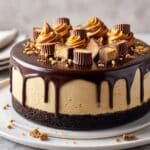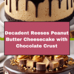 Indulge in a rich and creamy Reese’s Peanut Butter Cheesecake with a chocolate wafer cookie crust. This decadent dessert features a smooth peanut butter cream cheese filling studded with chopped Reese’s peanut butter cups, baked to perfection with a luscious, fudgy crust and topped with more peanut butter cups for an irresistible finish.