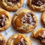 These Salted Caramel Cookies perfectly balance sweet and salty flavors with gooey caramel pockets and a hint of flaky sea salt on top. Soft and chewy with a golden edge, they are a delicious treat for any occasion, combining the richness of buttery dough with luscious caramel and optional chocolate chips.