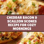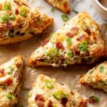 These savory scallion scones combine sharp cheddar cheese, crispy bacon, and fresh green onions for a deliciously flaky and flavorful treat. Perfect for breakfast, brunch, or a snack, these scones are baked to golden perfection and dusted with optional flaky sea salt for an extra burst of flavor.