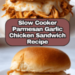 This Slow Cooker Parmesan Garlic Chicken Sandwich is a flavorful and easy-to-make meal that combines tender, shredded chicken cooked in a savory garlic parmesan broth, topped with melted mozzarella cheese and toasted garlic butter sandwich rolls. Perfect for a comforting lunch or dinner, this recipe requires minimal prep and uses a slow cooker for convenience.