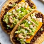 These Smash Burger Tacos combine the juicy, crispy goodness of a smash burger with the handheld convenience of a soft tortilla. Featuring seasoned ground beef cooked on a skillet until beautifully browned and topped with melted American cheese, these tacos are finished with fresh shredded iceberg lettuce, diced onions, and tangy dill pickle chips for a satisfying blend of flavors and textures perfect for a quick and delicious dinner.
