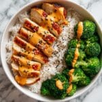 This Sticky Chicken Bowls recipe features tender chicken breast strips cooked in a flavorful sticky sauce, served over fluffy rice with steamed broccoli. Enhanced with a spicy mayo drizzle and sesame seed topping, this bowl is a perfect balance of sweet, savory, and spicy flavors for a satisfying and wholesome meal.
