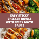 Keywords: Sticky Chicken Bowls, Chicken Bowl Recipe, Sticky Chicken, Spicy Mayo, Broccoli Chicken Bowl, Easy Dinner Recipe, Weeknight Meal