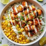 Keywords: Chicken rice bowl, street corn, grilled chicken, Mexican street food, easy weeknight dinner, cotija cheese, creamy corn topping