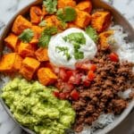 This Sweet Potato Taco Bowl combines roasted sweet potatoes with seasoned ground beef, fresh pico de gallo, creamy guacamole, and tangy sour cream for a colorful and comforting meal that’s easy to prepare and packed with vibrant flavors.