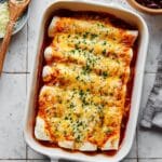 Store leftover enchiladas in an airtight container in the refrigerator for up to 3 days. Reheat in the oven at 350°F for 10–15 minutes or microwave until warmed through. To keep them from drying out, cover with foil while reheating in the oven.